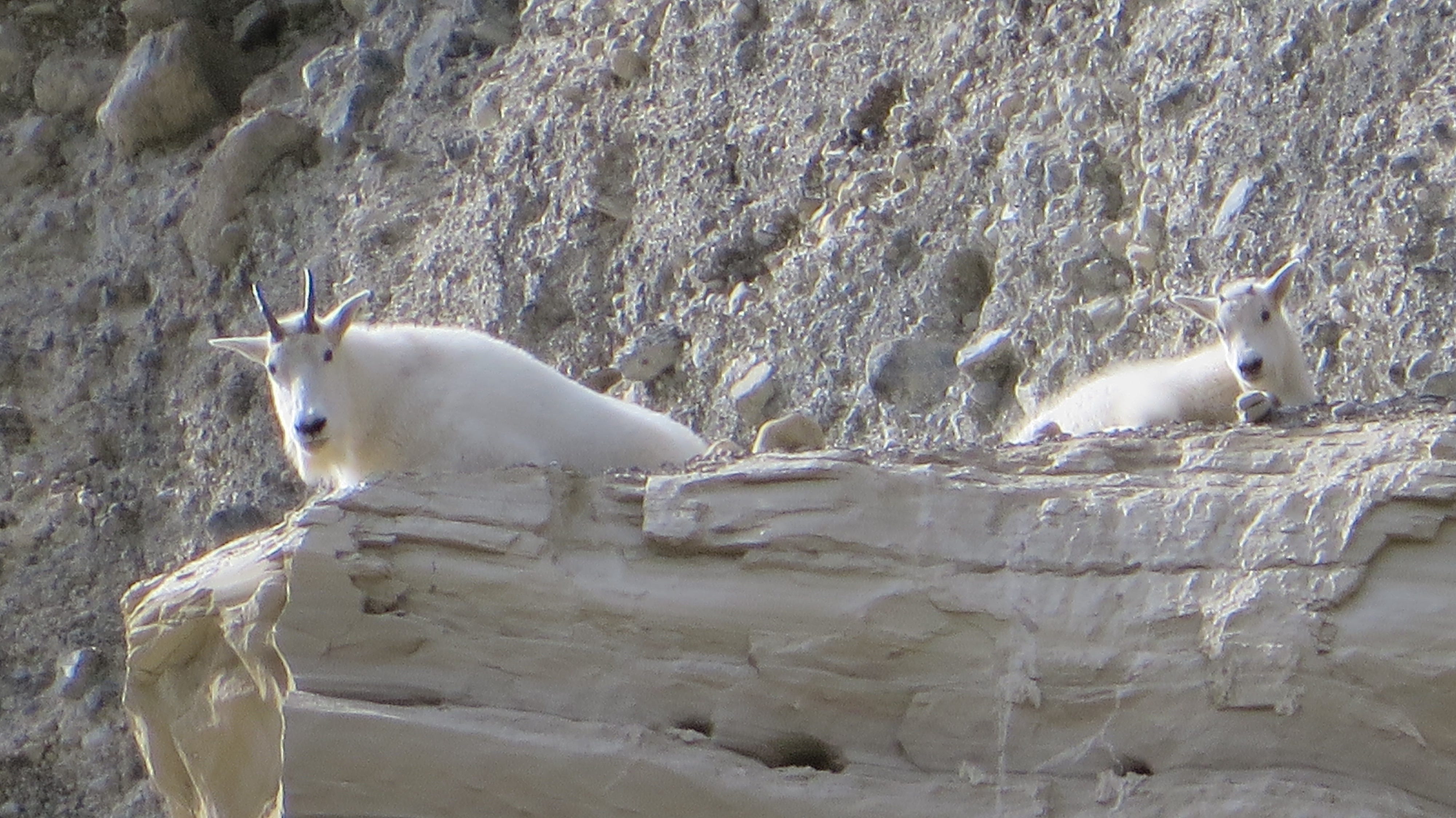 The mountain goat is an even-toed, hoofed mammal of the cattle family derived during the ice ages from the primitive Asiatic goat-antelopes. It entered North America during the last ice age from Siberia, according to Canadian Encyclopedia. It is not a true goat but belongs to a tribe ancestral to sheep and goats. The mountain goat, largest and most cold-hardy species of its tribe, is widely distributed in the Canadian western mountains below the Arctic circle. Adapted to life on steep cliffs where footholds are often covered by snow or ice, it is a slow, methodical climber who prefers to move during daylight when there is good visibility. It may select resting spots for the night already in the afternoon (which is likely what our nanny and kid did).